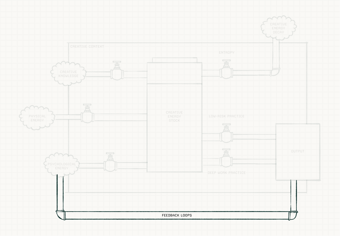 Positive feedback can feed into psychological energy by providing a sense of accomplishment and validation when the feedback is positive, and can increase creative confidence. On the other hand, constructive feedback can be used as an opportunity to learn and improve the next time, acting as a form of creative knowledge and an input back into our creative energy stock.