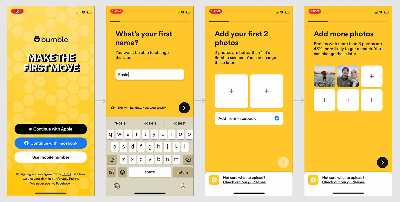 Bumble’s install to photo selection UX. Clean and simple, with extra information there for those who need it. Can you spot the little eye icon?