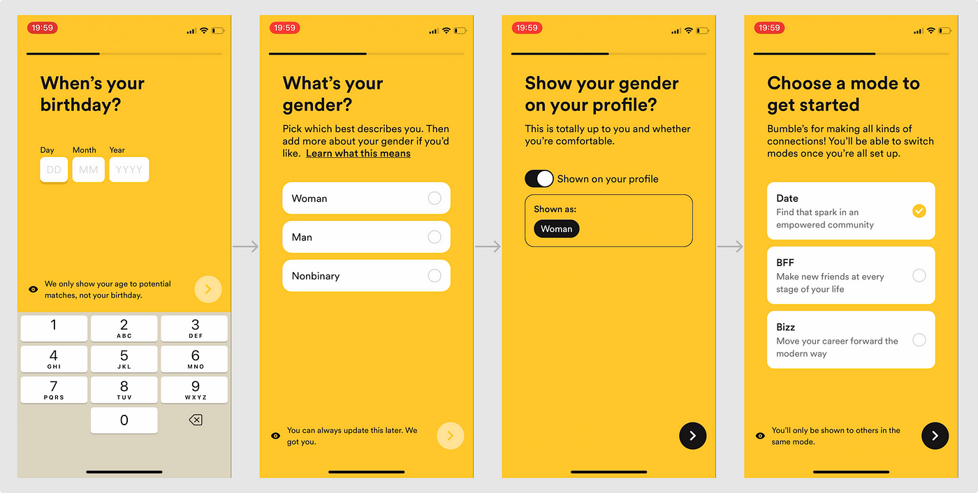 The first thing that jumped out to me in Bumble’s 15-step onboarding flow was how they put users at ease as soon as possible. From as early as the second and third onboarding screen, users are clear: