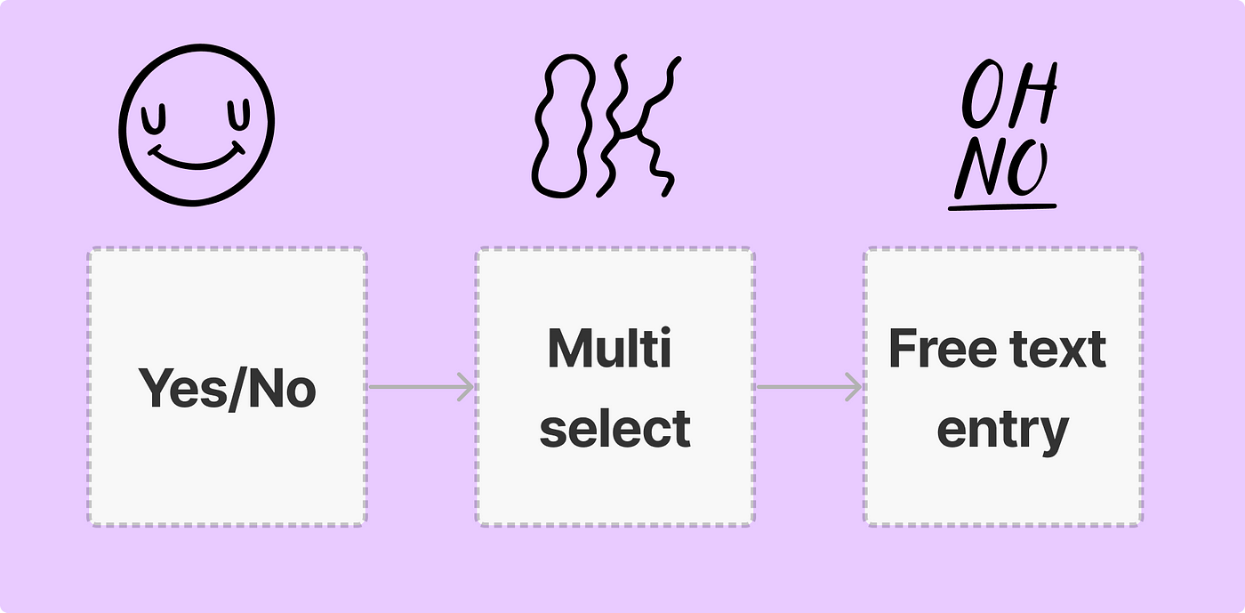 Every time we ask users for information, we lose their energy and attention bit by bit. On a scale of easy to hard, information gathering goes from: yes/no questions > multi select > free text entry (hardest)