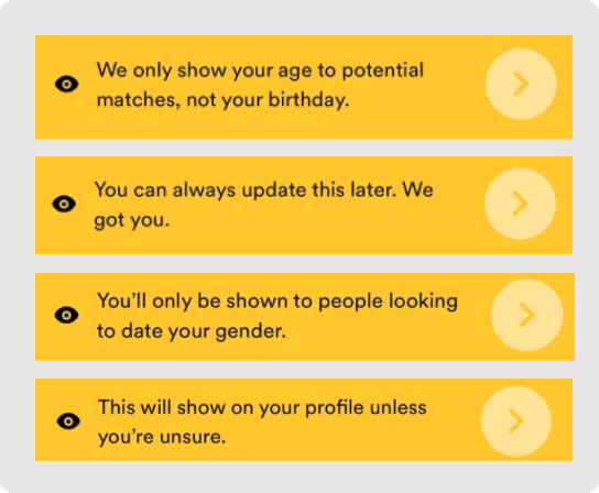 Small text descriptions next to the eye icon on Bumble’s intro screens calm the fears and anxieties of new users, such as: