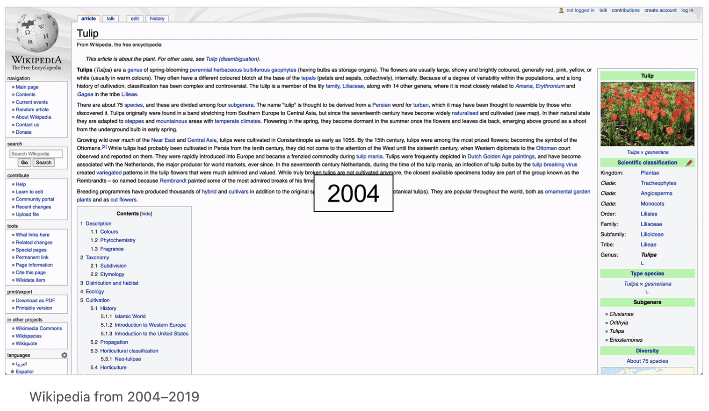 이야기를 잘 이해하기 위해, 예전으로 잠시 돌아가보자. 2004년, 위키피디아의 인터페이스가 매우 크게 변화했었다. 마크 주커버그가 TheFacebook을 런칭했고, 지메일이 출시되었으며, 스마트폰이라는 것이 없었던 시절이었다. (첫 아이폰은 그로부터 3년 뒤 나왔다.) 또한 CSS에도 제한이 꽤 많았고, 웹사이트들은 지금보다 훨씬 심플한 형태였다. 두 유명한 컴퓨터는 델의 디멘션 2400 데스크탑과 Latitude D505라는 랩탑이었다. 대부분 이 두 종류의 컴퓨터를 사용했기 때문에, 위키피디아는 이렇게 보였을 것이다: