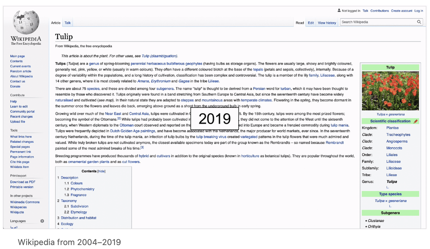 In 2010, a bunch of changes were made to increase the usability of Wikipedia for new editors (notes), and in 2015 the editing experience was again significantly improved with the introduction of the Visual Editor. However, the general layout, and specifically the reading experience, stayed largely the same between the 2004 update, and 2019, where this story begins.
