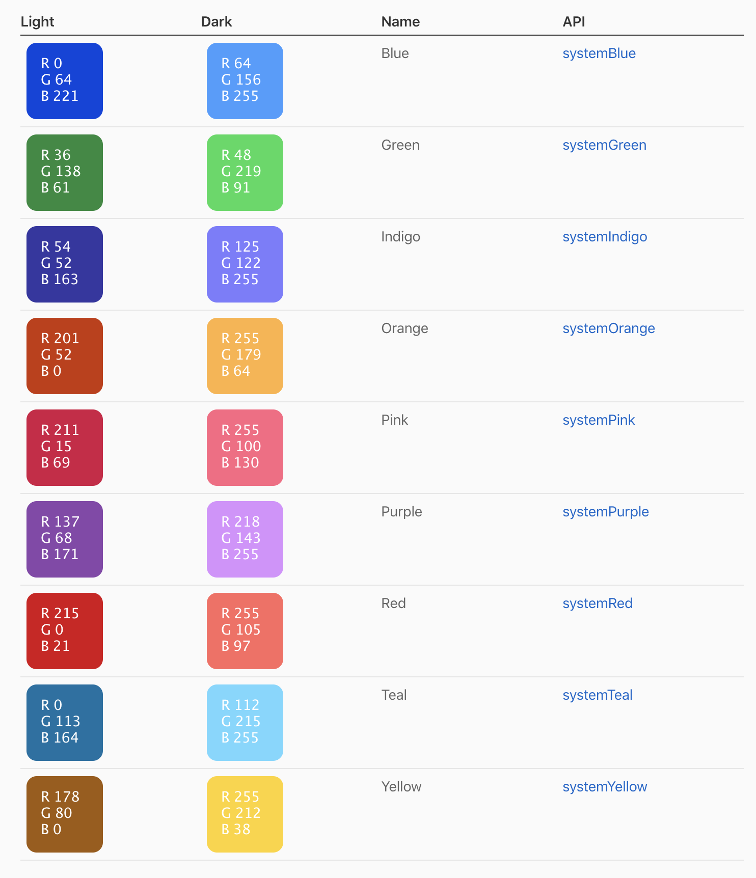Don't hard-code system color values in your app. The color values provided below are intended for reference during your app design process. The actual color values may fluctuate from release to release, based on a variety of environmental variables. Always use the API to apply system colors;