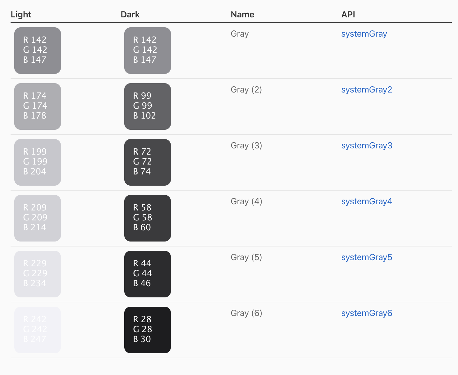또한 iOS 13에선 여섯개의 불투명 회색 색상값을 제공하여 투명도가 잘 적용되지 않는 드문 경우에 사용할 수 있도록 합니다. 예를 들어 선이나 표의 바 같이 서로 교차하거나 오버랩되는 요소인 경우 투명값과 함께 더 좋아보일 수 있습니다. 일반적인 경우 UI 요소엔 의미를 기준으로 정의된 시스템 컬러를 사용하세요.
