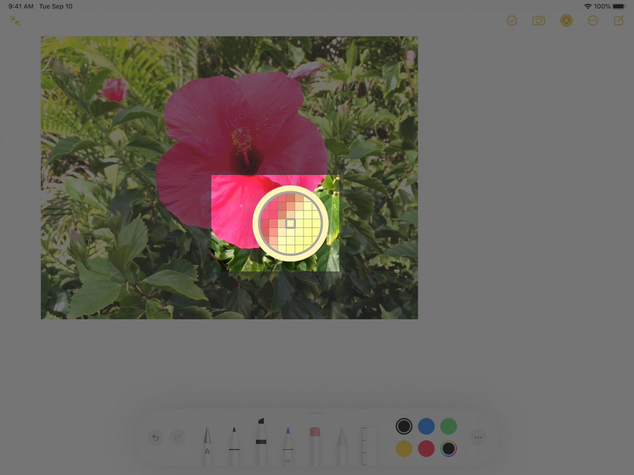 When tapped, a color well displays the system-provided color picker. People can use the color picker to choose a color for text, shapes, marking tools, and other elements.