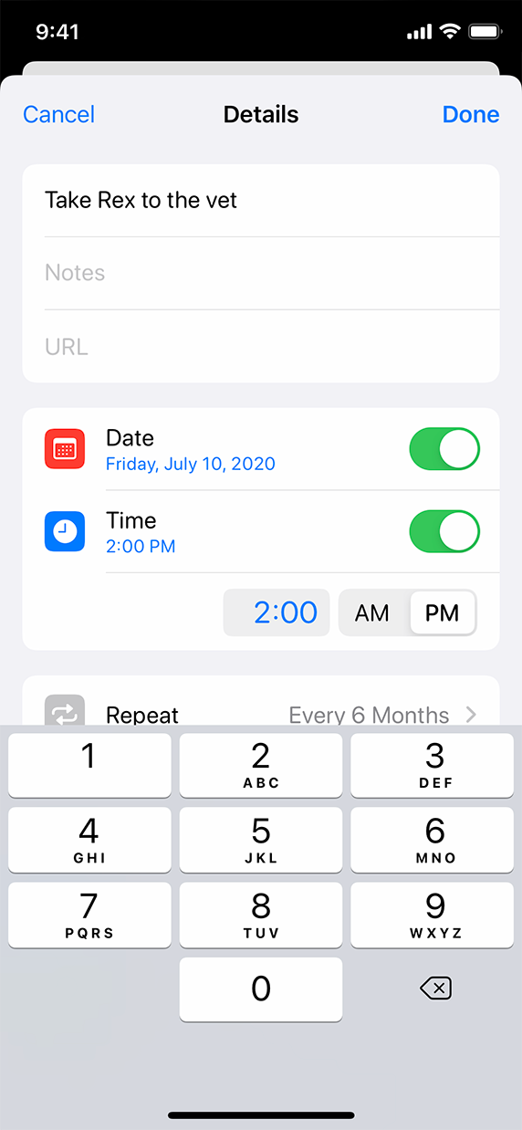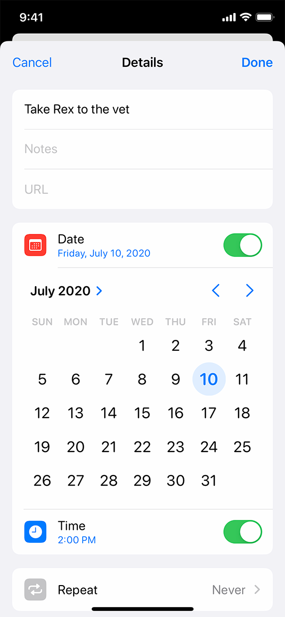 Use a compact date picker when space is constrained. When collapsed, the compact style displays a button that shows the current value in your app's accent color. When people tap the button, the date picker expands into a modal view, providing access to a familiar calendar-style editor and time picker. Within the modal view, people can make multiple edits to dates and times before tapping outside the view to confirm their choices.