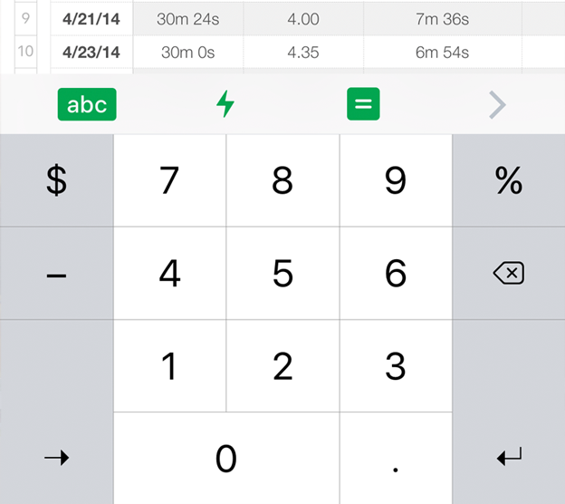 필요하다면 인풋 악세사리 뷰를 제공하세요. 몇 앱은 추가적으로 키보드 위에 나타나는 악세사리 뷰를 제공합니다. Numbers 앱에서는 악세사리 뷰를 사용해 사용자들이 표준 혹은 커스텀 계산값을 입력할 수 있도록 돕습니다.