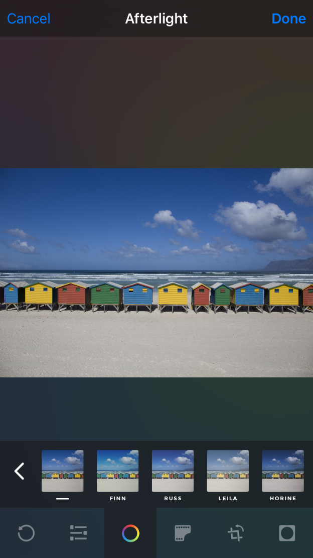 To access a photo editing extension, a photo must be in edit mode. While in edit mode, tapping the extension icon in the toolbar displays an action menu of available editing extensions. Selecting one displays the extension’s interface in a modal view containing a navigation bar. Dismissing this view confirms and saves the edit, or cancels it and returns to the Photos app.