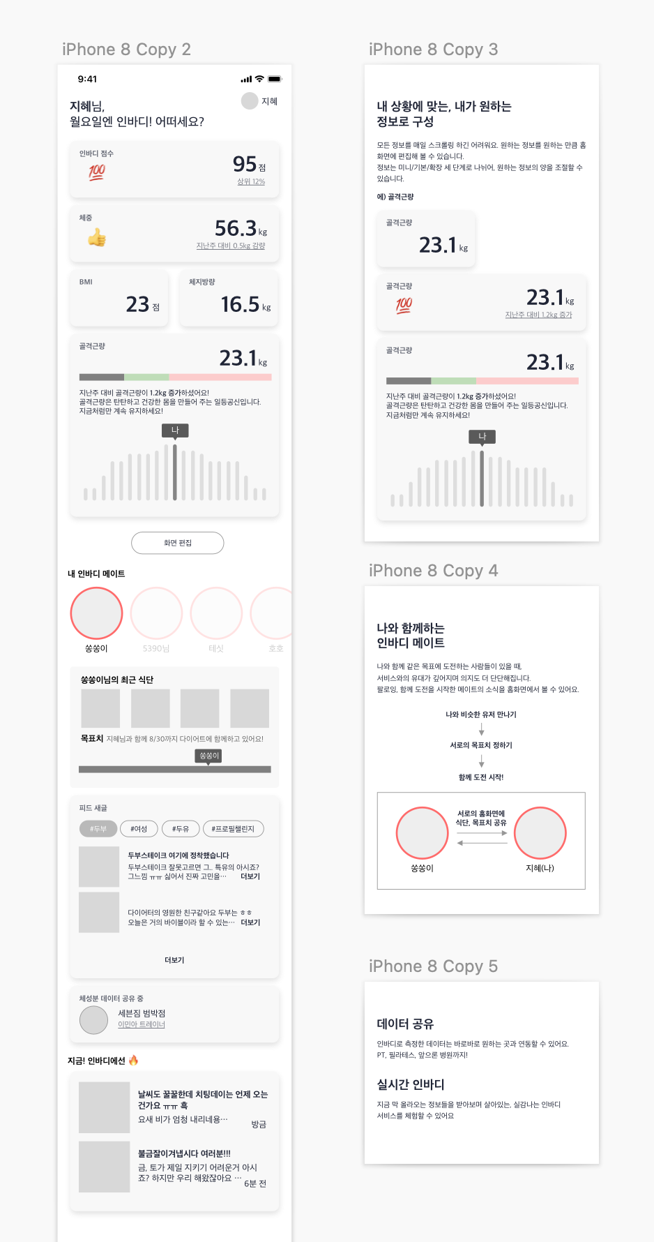 홈화면에 내 인바디 정보 뿐 아니라, 팔로잉하는 소식, 지금 막 뜨고있는 소식, 내 레벨, .... 거기에 ux writing을 좀 곁들인..